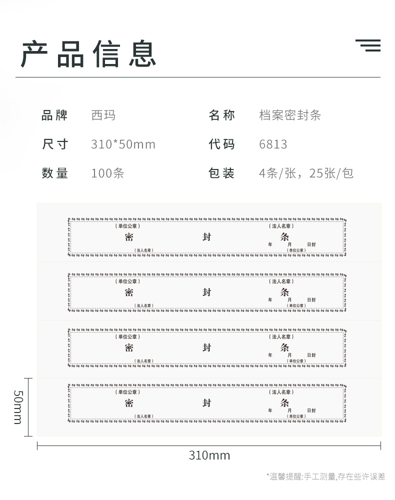 西玛(SIMAA)100条不干胶档案密封条 投标文件袋封口条 资料档案袋封条 无须胶水密封条6813
